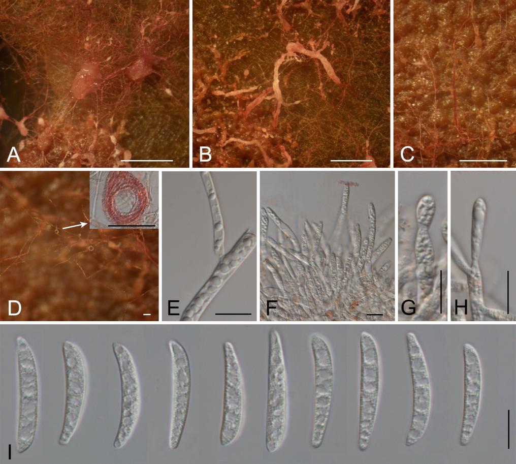 西藏梭孢菌的形態。A、B:PDA上形成的分生孢子團,C:紅色的菌絲,D:菌絲結環,E:透明的菌絲,F-H:產孢細胞及初生的分生孢子,I:分生孢子。標尺A-C=500μm;D=50μm;E-I=10μm。(西藏自治區生態環境廳供圖)