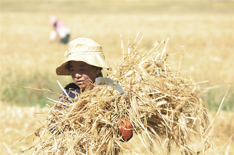 金秋九月,風吹麥浪、穗粒飽滿,連日來,在墨竹工卡縣金黃色的農田里,處處可見勤勞的農民們搶抓時機,開展小油菜和青稞收割、晾曬、搬運、儲藏,確保糧食顆粒歸倉。