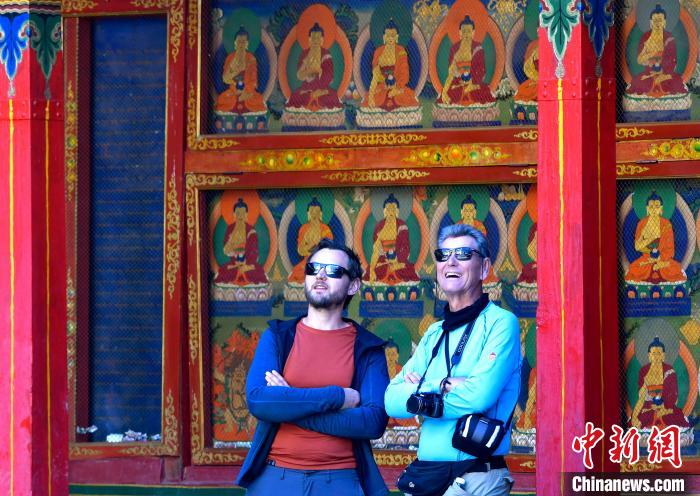 10月1日,外國游客在西藏自治區日喀則市扎什倫布寺內參觀。國慶假期首日,始建于公元1447年的扎什倫布寺成為眾多中外游客的首選。中新社記者 李林 攝