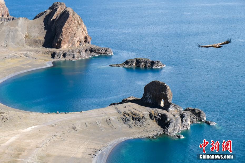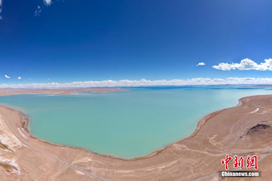 國慶期間,中新網記者自駕西藏藏北羌塘草原,途經“天湖”納木錯,高原鹽湖班戈湖以及西藏第一大湖色林錯等地。秋天高原藍天白云的映襯下,藏北湖泊猶如一面面巨大的“寶石藍”鏡子鑲嵌于高原大地,景色壯麗。圖為10月2日,航拍西藏第一大湖色林錯北岸風光。記者 江飛波 攝