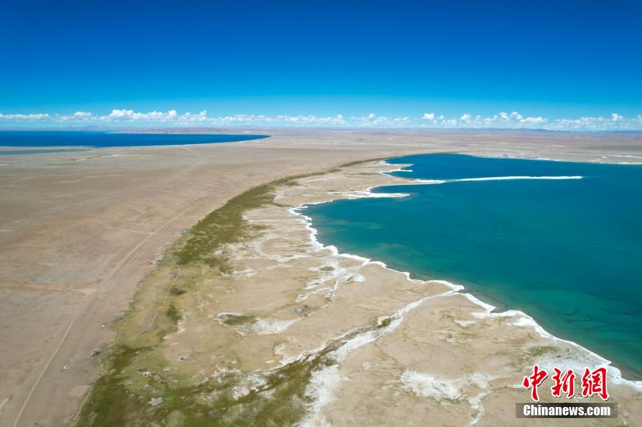 國慶期間,中新網記者自駕西藏藏北羌塘草原,途經“天湖”納木錯,高原鹽湖班戈湖以及西藏第一大湖色林錯等地。秋天高原藍天白云的映襯下,藏北湖泊猶如一面面巨大的“寶石藍”鏡子鑲嵌于高原大地,景色壯麗。圖為10月2日,西藏班戈縣班戈湖,畫面左上角為色林錯。記者 江飛波 攝