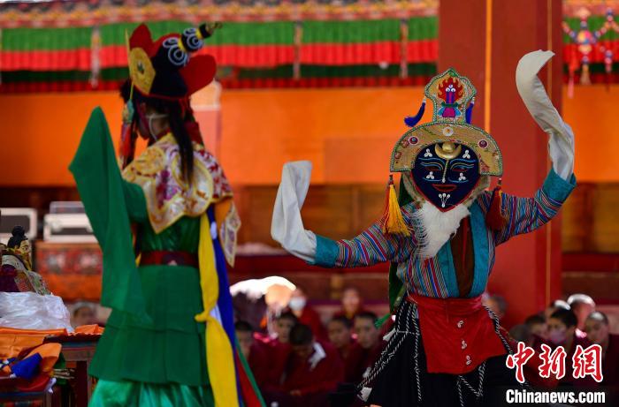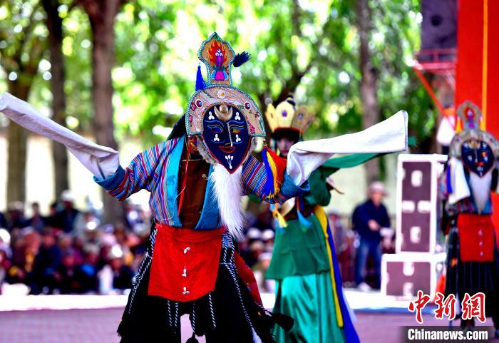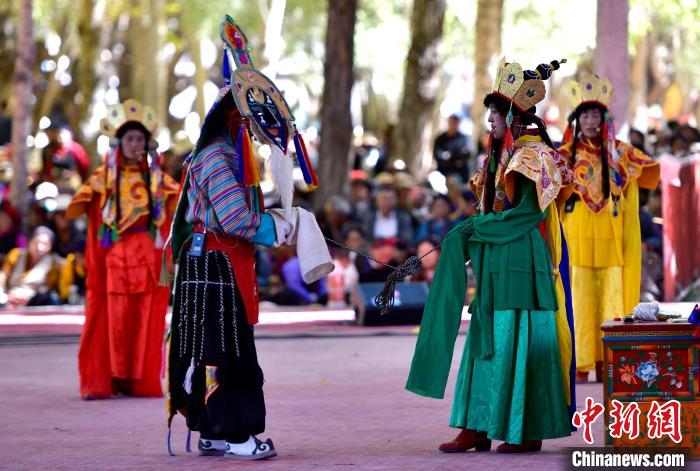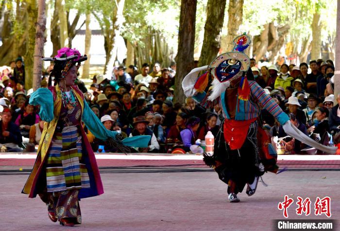 10月7日,西藏自治區日喀則市扎什倫布寺內上演傳統八大藏戲之一《諾桑王子》,吸引僧俗民眾觀看。藏戲集說唱、表演、歌舞、文學于一體,有著600多年歷史,被譽為藏文化的“活化石”。中新社記者 李林 攝