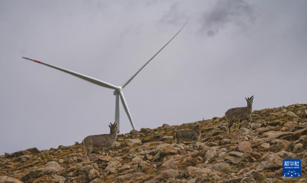10月17日拍攝的位于西藏日喀則市薩迦縣的風力發電機組及周圍山上的野生動物。新華社記者 晉美多吉 攝??