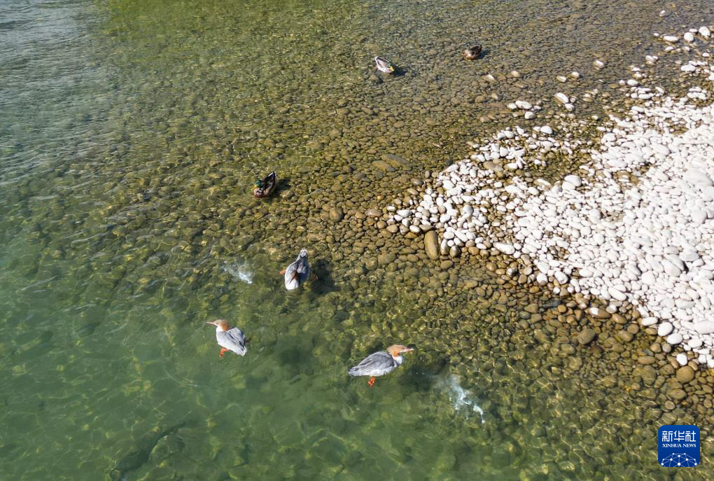 在林芝雅尼國家濕地公園內,不同種類的野生鳥類棲息在尼洋河畔(10月24日攝,無人機照片)。新華社記者 劉天宇 攝