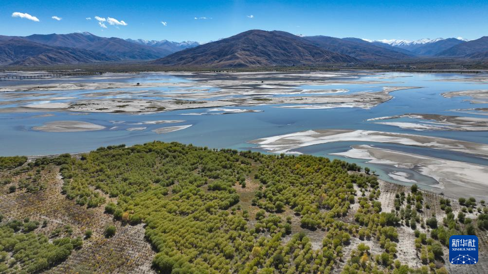 這是雅魯藏布江寬闊的河床和岸邊種植的樹木(2024年10月24日攝,無人機照片)。新華社記者 晉美多吉 攝