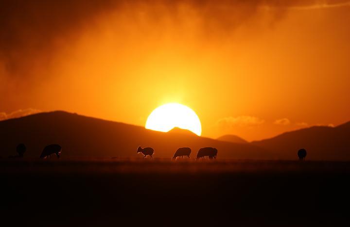 第二天清晨,我來到受傷母羊倒下的地方,它的生命已經(jīng)逝去。此時(shí),一輪紅日正在從它身后升起,不一會(huì)兒,一大群懷孕的母羊從它身邊經(jīng)過,它們走出黑夜,走向朝霞與陽(yáng)光,步履不停。