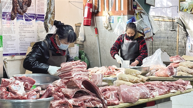 納金綜合批發商貿城豬肉攤店老板魏女士介紹,目前豬肉銷量上漲,價格和之前相差不多,其中冷鮮豬排每斤28元、豬五花肉每斤18元、豬棒骨每斤10元、豬里脊(不帶皮)每斤16元,新鮮香腸每斤40元。她告訴記者:“我們店的豬肉質量很好,賣得特別好,平時除了賣給散客外,也經常有餐飲店來我們這訂購豬肉。”除了豬肉,牛羊肉的價格也較為平穩,其中牛肉每斤40元左右、牛排每斤35元左右、羊肉和羊排每斤都是35元左右。此外,雞鴨鵝等禽類商品銷量上漲,價格基本與前幾月持平。