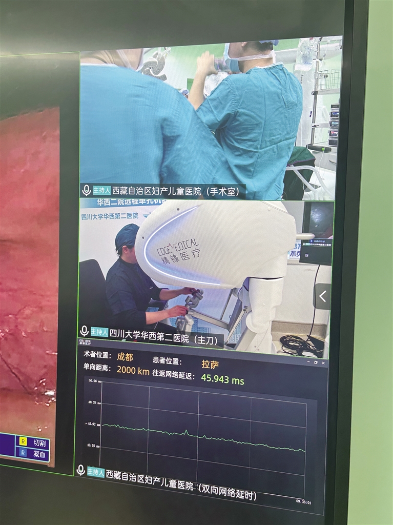 梅玲介紹,此次手術是與四川大學華西第二醫院聯合開展的,由四川大學華西第二醫院的鄭瑩教授團隊主刀,并依托華西的先進技術平臺,通過遠程方式完成手術。手術結束后,鄭瑩教授通過視頻向大家介紹,這場跨越2000公里距離與3000米海拔差異的手術,總共用時1小時45分鐘,網絡延遲僅40毫秒。“此次手術的成功為今后更多優質資源技術送達偏遠地區提供了重要參考,也為提高西藏醫療水平打下了堅實的基礎。”鄭瑩說。
