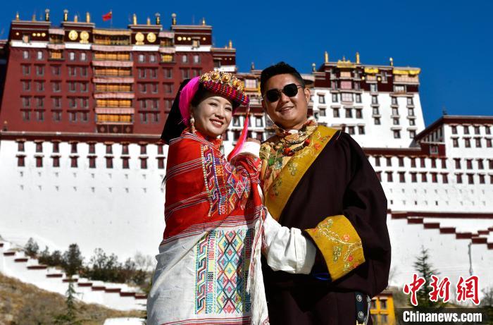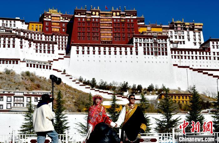圖為12月3日,來自四川的勇忠阿旦(右一)和澤仁夏姆在布達拉宮廣場拍照留念。中新社記者 李林 攝