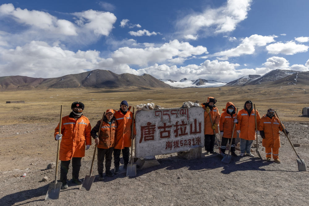 記者一行到達唐古拉山口時,7名身穿橙色制服的養路工人,正在用鐵鍬修補路肩。盡管太陽高懸,風速卻不小,用來警示隔離的錐形交通路標不斷被大風吹倒,工人們不時要把它們扶正。