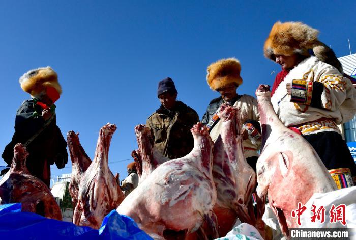 12月6日,西藏自治區(qū)那曲市申扎縣第十八屆畜產(chǎn)品展銷會(huì)現(xiàn)場,民眾挑選羊肉。 李林 攝