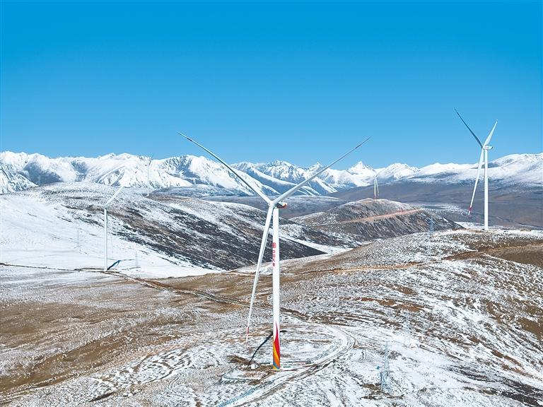 這個風電項目是藏東南地區的第一個風電項目,規劃建設20臺5兆瓦風電機組,其中最高的機組在海拔5200米,是目前已投產風電項目中海拔最高和超高海拔地區單機容量最大的風電項目。今年4月項目開工以來,歷時6個月完成全部20臺風機吊裝作業。該風電項目建成投產后不僅能有效優化西藏的能源結構,而且可以在冬季用電高峰期保障當地電力安全供應。