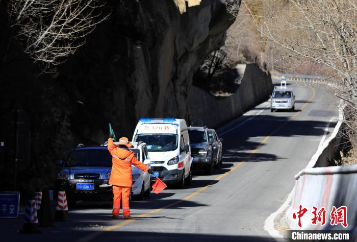 12月16日,西藏自治區林芝公路事業發展和應急保障中心(工布江達養護段)道路養護工人及時清除川藏公路上的落石,保障道路暢通。該養護段擔負著川藏公路沿線工布江達縣路段的養護管理、應急搶險等工作,包括路面修補、清理邊溝、維護交通安全設施等日常養護工作。圖為養護工人引導往來車輛。中新社記者 王磊 攝