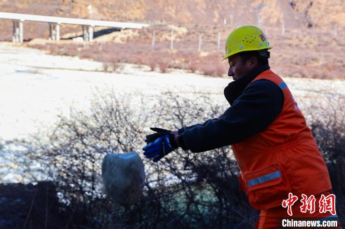 12月16日,西藏自治區林芝公路事業發展和應急保障中心(工布江達養護段)道路養護工人及時清除川藏公路上的落石,保障道路暢通。該養護段擔負著川藏公路沿線工布江達縣路段的養護管理、應急搶險等工作,包括路面修補、清理邊溝、維護交通安全設施等日常養護工作。圖為養護工人在公路上巡護。中新社記者 薛蒂 攝