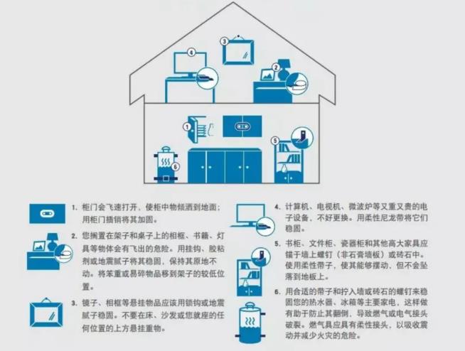在日常生活、學(xué)習(xí)、工作中,要會識別和分析家中及辦公環(huán)境的地震災(zāi)害風險隱患,尤其是那些容易傾倒的大型家具、容易砸到人的懸掛物、發(fā)生位移容易損壞的燃氣管道和電線等裝置以及在上班、上學(xué)途中的巨大的廣告牌和玻璃幕墻。