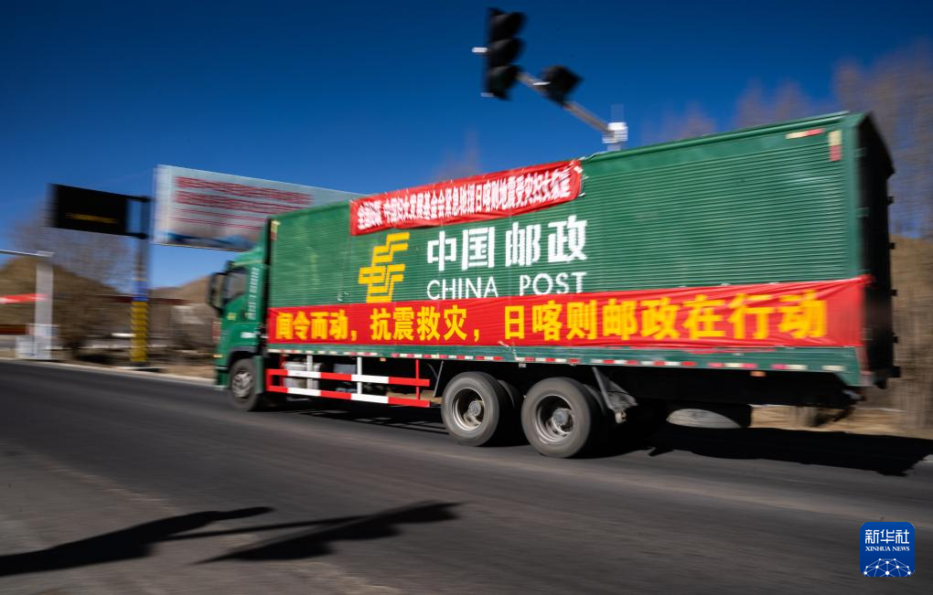 1月8日,在日喀則市境內的318國道,中國郵政的抗震救災運輸車輛向災區方向駛去。新華社記者 丁增尼達 攝