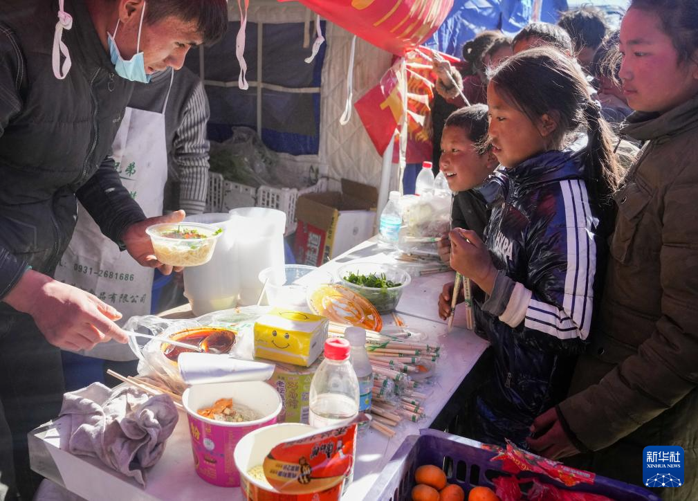 1月8日,在日喀則市定日縣長所鄉森嘎村的臨時安置點,馬仁(左一)為受災小朋友免費供應面食。據馬仁介紹,他來自定日縣,和朋友一起來臨時安置點為災區群眾免費提供面食。據悉,從7日下午兩點開始,他們已送出近1200份面食。新華社記者 丁汀 攝
