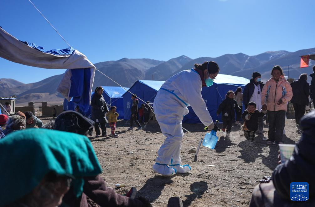 1月8日,在定日縣措果鄉野江村安置點,醫護人員進行消殺。新華社記者 晉美多吉 攝