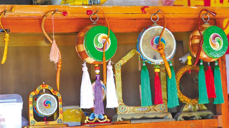 這時,一位從那曲趕來的顧客來找貢秋頓珠定制鼓。貢秋頓珠熱情地將顧客引入小院,向其展示已制成的鼓并敲擊試聽。顧客對鼓的精美形狀和上乘質量贊不絕口,當即定制了兩面鼓。憑借多年的精湛技藝,貢秋頓珠制作的鼓聲名遠播,訂單源源不斷。