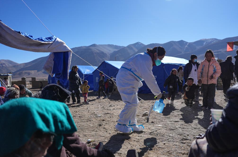 1月8日,在定日縣措果鄉野江村安置點,醫護人員進行消殺。