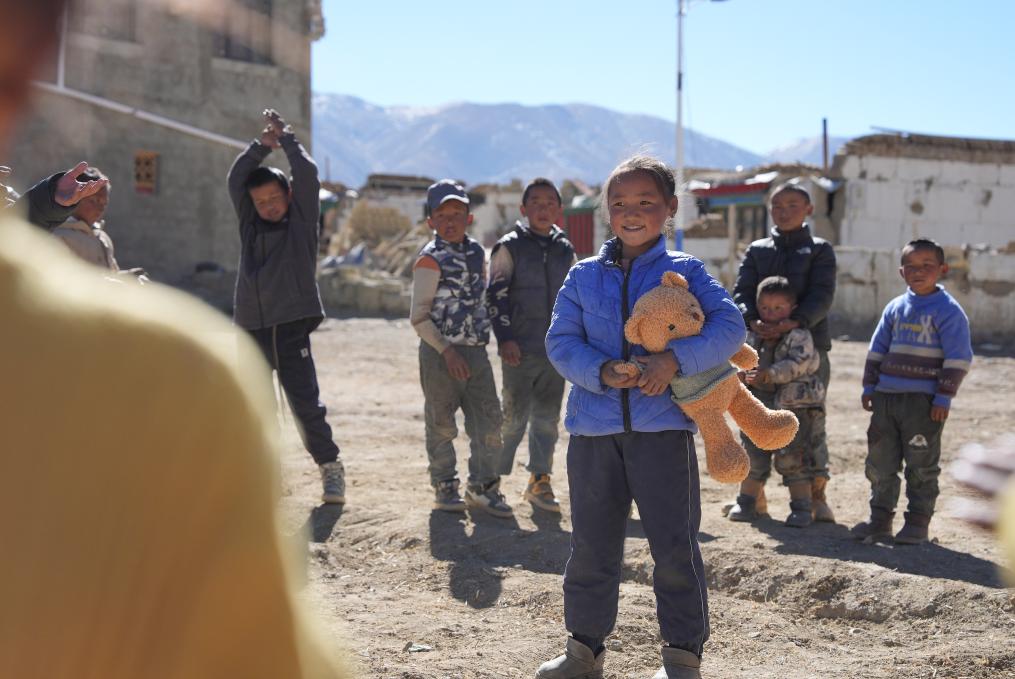 1月8日,在日喀則市定日縣措果鄉塘仁村地震災后安置點,西藏星光社會工作服務中心社工向孩子們贈送玩偶熊,并給他們表演節目。