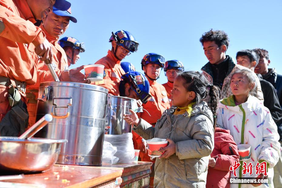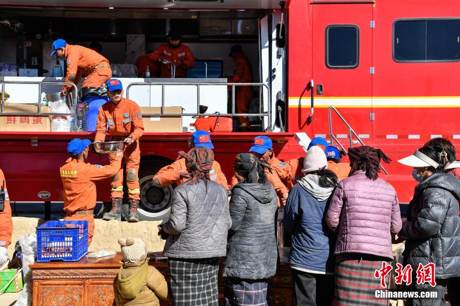 1月9日,西藏自治區定日縣曲洛鄉措昂村安置點,西藏自治區森林消防總隊救援人員為受災民眾提供飲食。當日,位于西藏自治區定日縣曲洛鄉措昂村安置點,西藏各級救援人員和愛心企業不斷轉運、發放生活物資、搭建活動板房、全力保障受災民眾的飲食供應等,保障受災民眾基本生活。中新社記者 貢嘎來松 攝