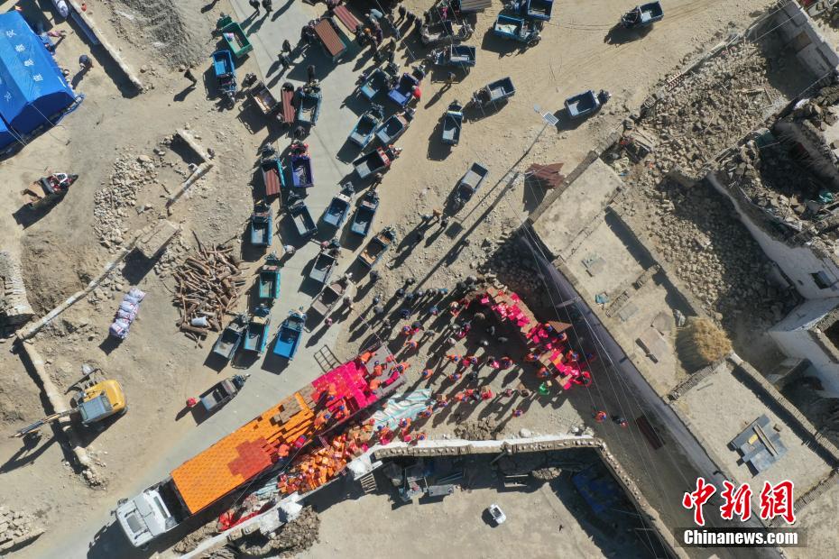 1月9日,西藏自治區定日縣曲洛鄉措昂村安置點,救援人員發放救災物資床墊。當日,位于西藏自治區定日縣曲洛鄉措昂村安置點,西藏各級救援人員和愛心企業不斷轉運、發放生活物資、搭建安置板房、全力保障受災民眾的飲食供應等,保障受災民眾基本生活。(無人機照片)中新社記者 貢嘎來松 攝