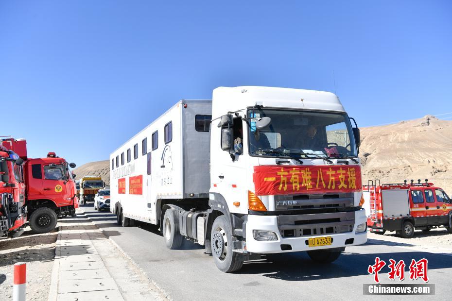 1月9日,西藏自治區定日縣曲洛鄉措昂村,滿載救災物資的貨車抵達安置點。當日,位于西藏自治區定日縣曲洛鄉措昂村安置點,西藏各級救援人員和愛心企業不斷轉運、發放生活物資、搭建活動板房、全力保障受災民眾的飲食供應等,保障受災民眾基本生活。中新社記者 貢嘎來松 攝