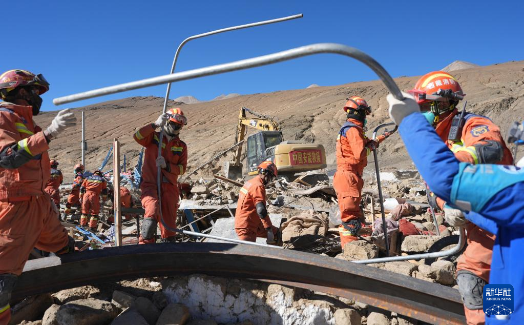 1月10日,救援人員在定日縣長(zhǎng)所鄉(xiāng)古榮村清理震后廢墟。新華社記者 沈伯韓 攝