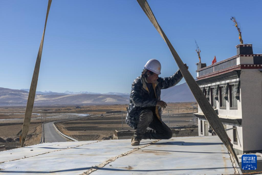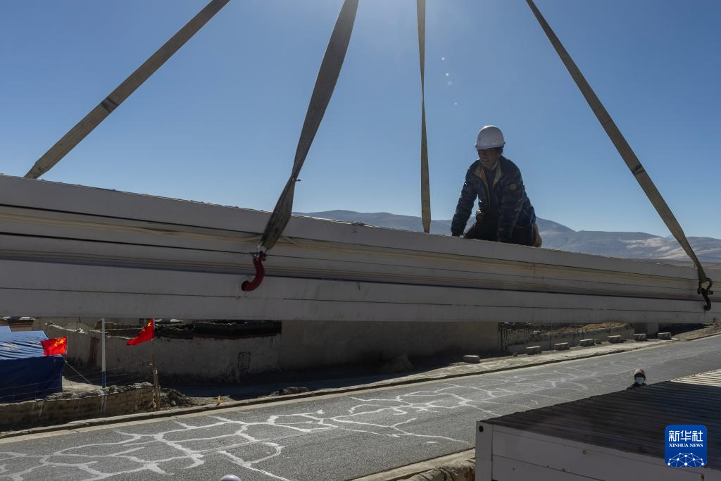 當日,在薩迦縣麻布加鄉白拉村,工程人員與有相應技術的村民一起建設活動板房。據了解,這是薩迦縣地震災區開建的第一批板房。
