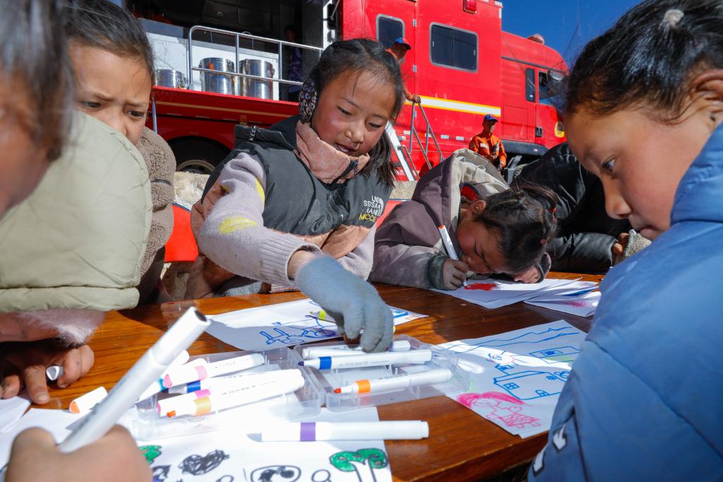 1月11日,在定日縣曲洛鄉措昂村臨時安置帳篷間的空地上,孩子們在畫畫。(新華社記者 沈伯韓 攝)