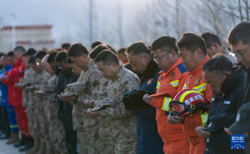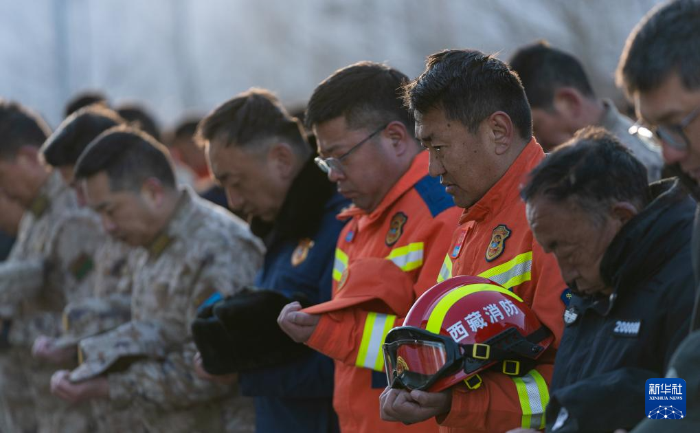 1月13日上午9時30分,西藏定日6.8級地震遇難同胞悼念儀式在受災最嚴重的長所鄉舉行。參與救援的解放軍和武警官兵、消防救援人員、公安民警、醫護人員、青年志愿者及有關企業員工、干部職工、震區群眾代表數百人,脫帽肅立,向遇難同胞默哀3分鐘。新華社記者 丁增尼達 攝