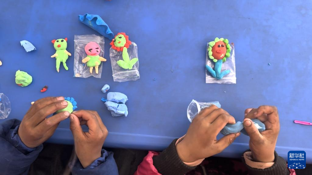 1月13日中午,在定日縣曲洛鄉措娃村安置點的兒童友好空間,孩子們在社工指導下捏塑超輕黏土。新華社記者索朗德吉 攝