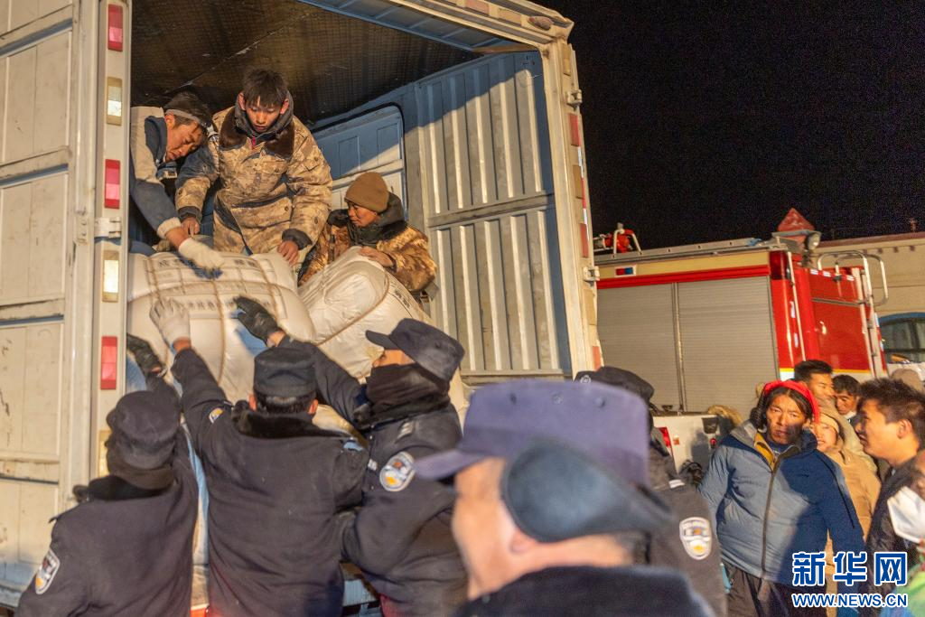1月9日,救援人員在拉孜縣拉孜鎮措布村卸載救災物資。新華社記者 姜帆 攝