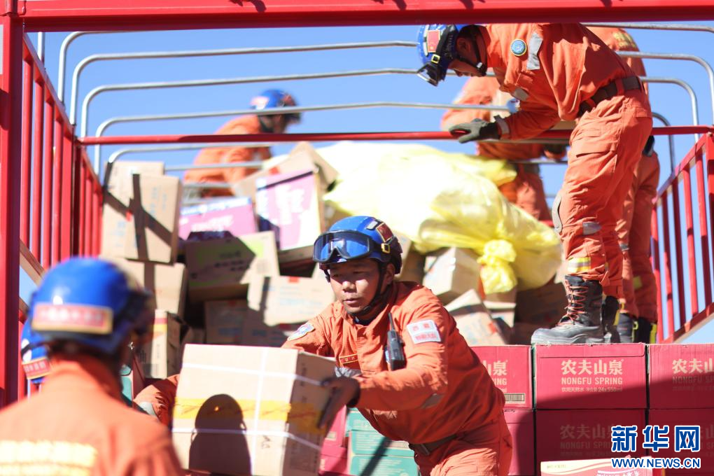 1月8日,救援人員在定日縣尼轄鄉卸載救援物資。 新華社記者 姜帆 攝