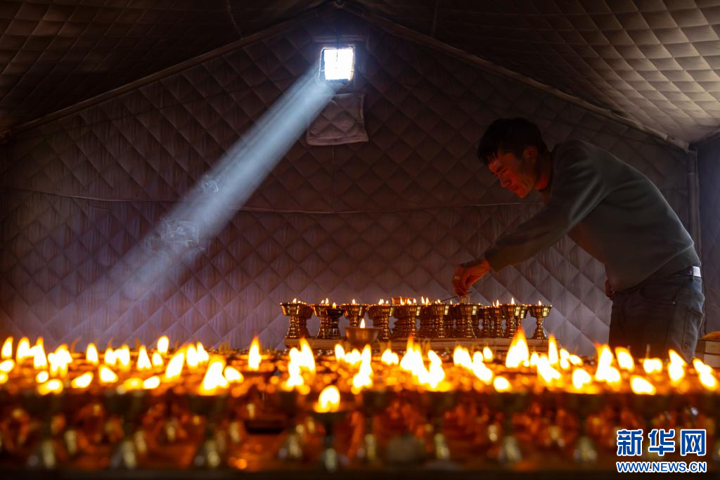 1月12日,在定日縣長所鄉古榮村,一名受災村民為在定日縣6.8級地震中逝世的親人點長明燈祈福。新華社記者 沈伯韓 攝
