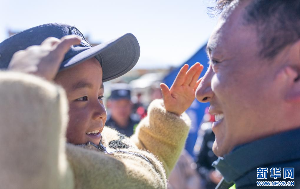 在定日縣長所鄉嘎布村,一個孩子戴上移民警察米瑪次仁的帽子敬禮(1月14日攝)。 新華社記者 丁增尼達 攝