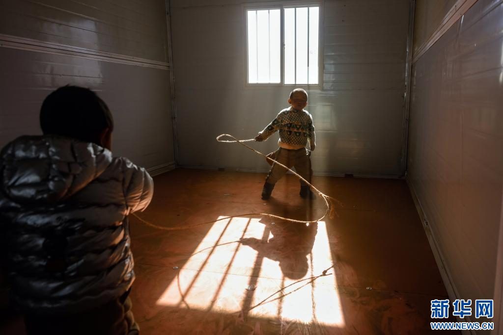 1月10日,在定日縣長所鄉古榮村,兩名小朋友在搬入的板房內玩耍。新華社記者 沈伯韓 攝