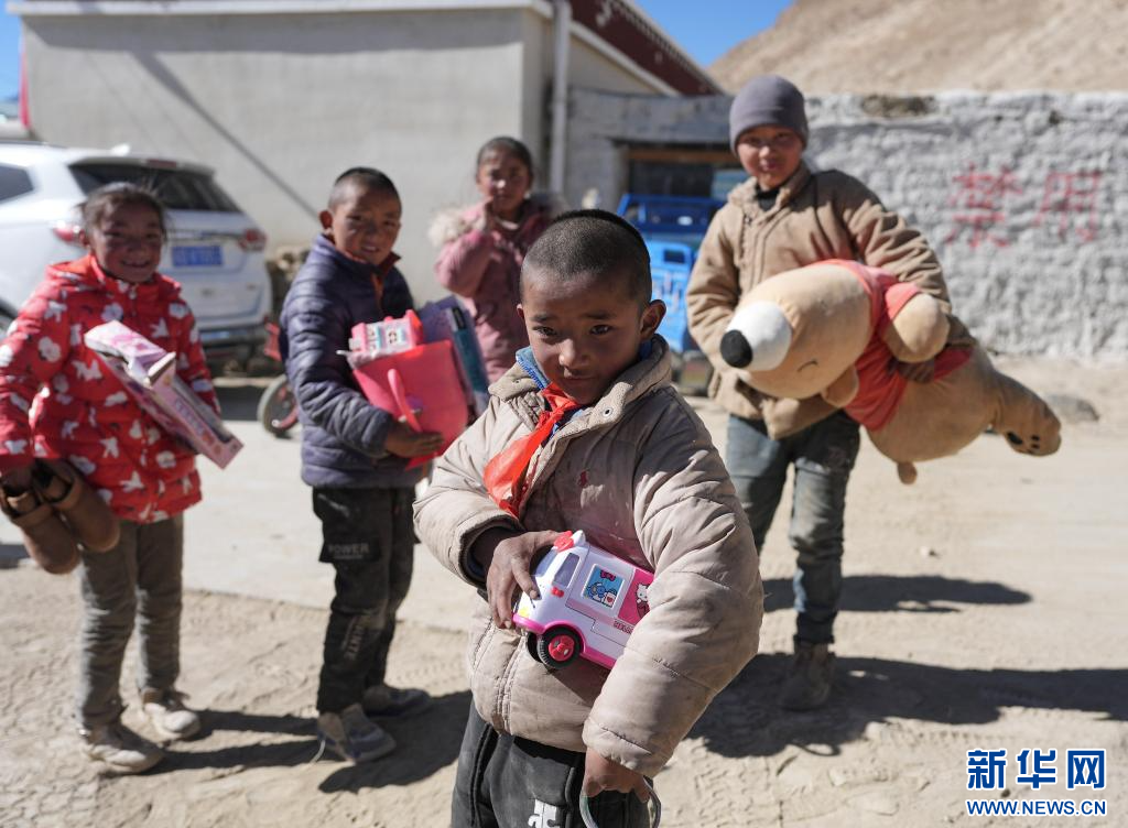 1月11日,災區的孩子們領到了愛心人士捐贈的玩具。新華社記者 晉美多吉 攝