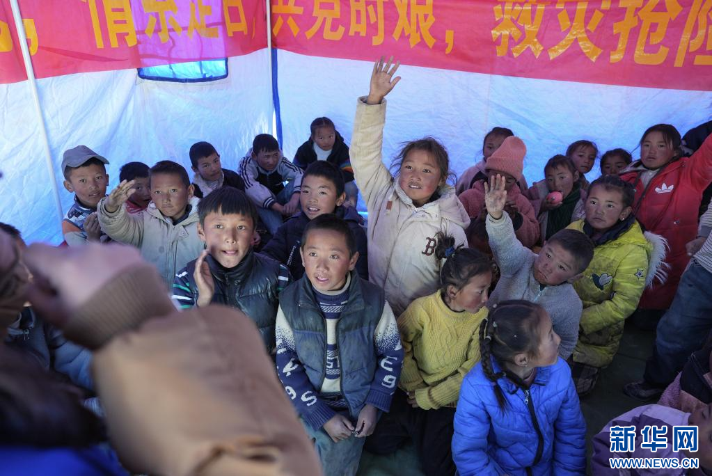 1月8日,塘仁村安置點的孩子們和社工老師們玩游戲,緩解心理壓力。新華社記者 晉美多吉 攝