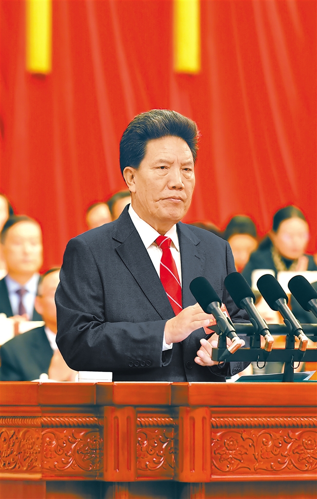 全國人大常委會副委員長、自治區人大常委會主任洛桑江村向大會作自治區人大常委會工作報告。記者 次仁平措 攝