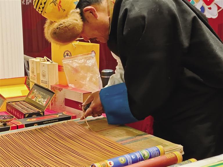 藏香制作技藝是西藏尼木縣吞巴鄉的傳統技藝,2008年被列入第二批國家級非物質文化遺產名錄。藏香由多種名貴藥材配制,制作工藝復雜,需經研磨、攪拌、熬煮、晾曬等步驟。其香氣濃郁持久,燃燒煙霧少,還有安神清心、健脾等藥用功效。游客劉先生買了兩袋藏香,他表示:“這是我第二次來西藏,上次帶回去的藏香很喜歡,這次特意來買。沒想到遇上展銷,太幸運了!”