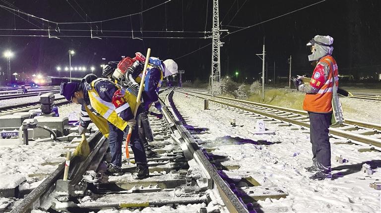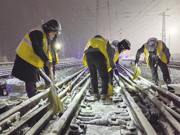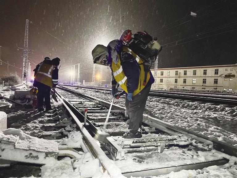 “我們繼續(xù)往前走,檢查下一組道岔。”盡管他們的眉毛、睫毛上都結(jié)滿了冰晶,但這并不能阻擋大家迎戰(zhàn)風(fēng)雪、護(hù)航春運(yùn)的堅(jiān)定步伐。7時(shí)30分,經(jīng)過長(zhǎng)達(dá)300分鐘緊張有序的作業(yè),拉薩西貨場(chǎng)道岔積雪終于清理完畢。
