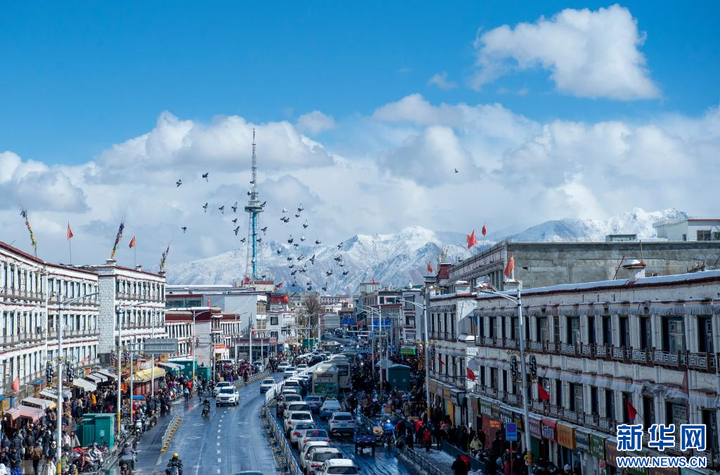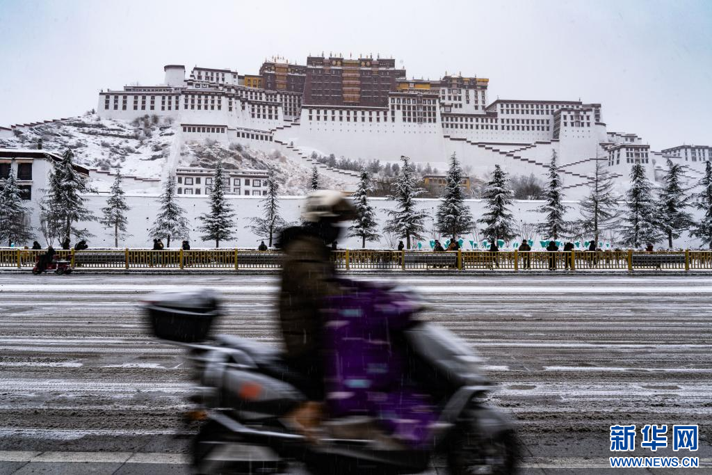 當日是農歷臘月初八,西藏拉薩市迎來降雪,城區銀裝素裹,雪景分外優美,吸引了眾多市民外出拍攝游玩。