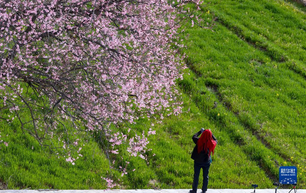 游客在索松村桃花林間拍照(4月5日攝)。新華社記者 姜帆 攝