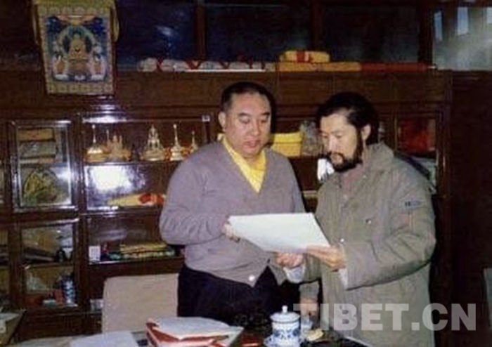 圖為1987年初,十世班禪大師和畫家洛松向秋探討援助西藏發展基金會徽標事宜。