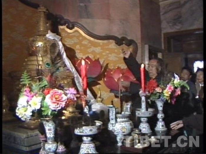 圖為1987年4月,十世班禪大師和阿沛o阿旺晉美率領援助西藏發展基金會籌備委員會委員朝拜靈光寺佛牙舍利塔,并親自敬獻哈達。