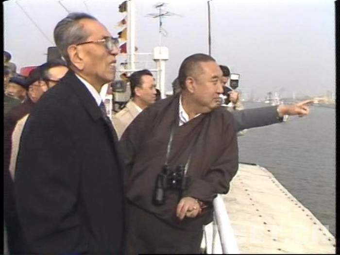 圖為1987年4月19日,十世班禪大師和阿沛o阿旺晉美率領援助西藏發展基金會籌備委員會委員考察天津港。