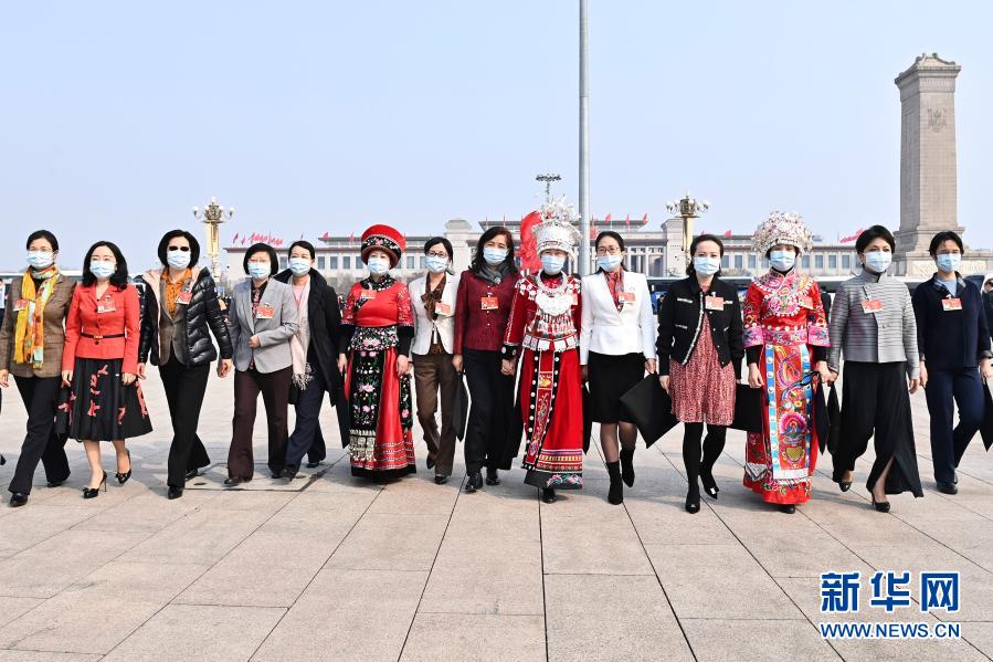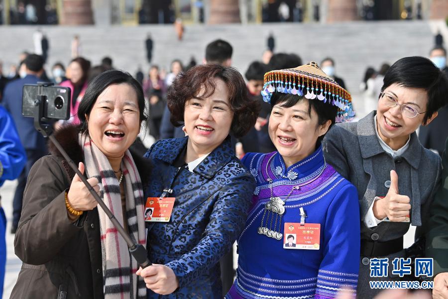 3月7日,全國政協十三屆四次會議在北京人民大會堂舉行第二次全體會議。這是會議結束后,政協委員夏寧、區捷、韋震玲、楊靜華(從左至右)在人民大會堂外合影。新華社記者 李鑫 攝