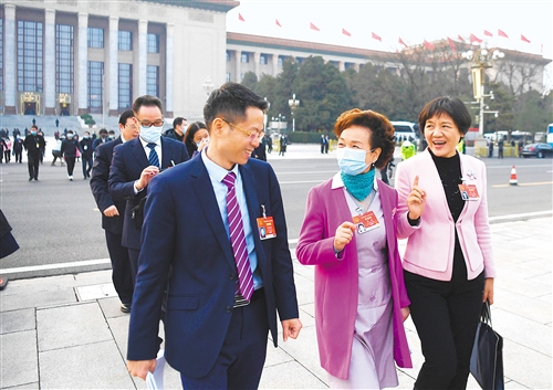 3月8日,十三屆全國人大四次會議在北京人民大會堂舉行第二次全體會議。會后,人大廣東代表團代表陳旭斌(左)、程萍(中)、郭姣(右)就宏觀政策保持穩定等話題繼續交流。經濟日報-中國經濟網記者 李景錄攝